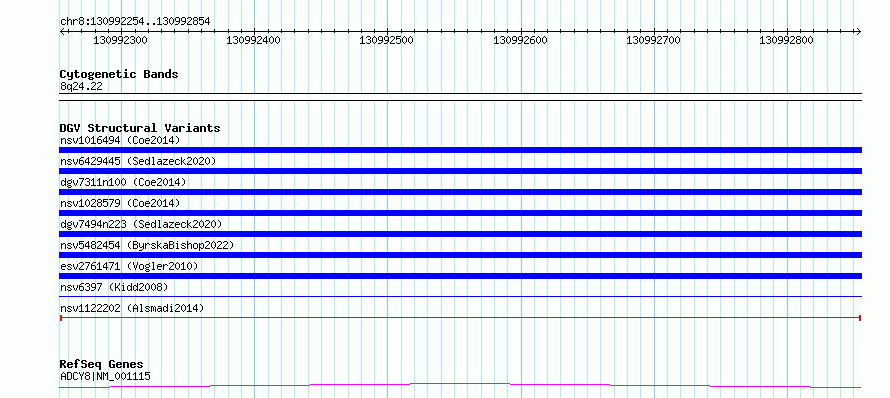 Variant DetailsVariant: nsv1122202| Internal ID | 19272088 | | Landmark | | | Location Information | | | Cytoband | 8q24.22 | | Allele length | | Assembly | Allele length | | hg38 | 601 | | hg19 | 601 |