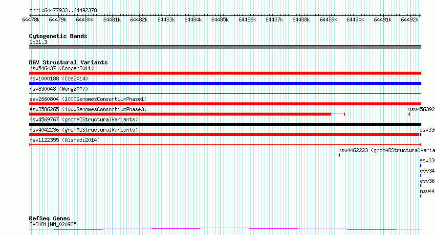 Variant DetailsVariant: nsv1122355| Internal ID | 18923041 | | Landmark | | | Location Information | | | Cytoband | 1p31.3 | | Allele length | | Assembly | Allele length | | hg38 | 14446 | | hg19 | 14446 |
