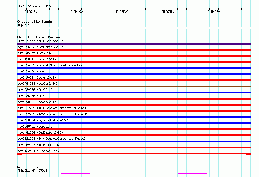 Variant DetailsVariant: nsv1122484| Internal ID | 19274458 | | Landmark | | | Location Information | | | Cytoband | 10p15.1 | | Allele length | | Assembly | Allele length | | hg38 | 51 | | hg19 | 61 |