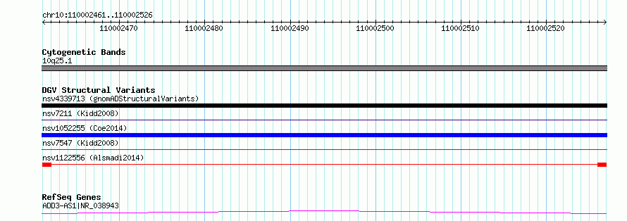 Variant DetailsVariant: nsv1122556| Internal ID | 18912066 | | Landmark | | | Location Information | | | Cytoband | 10q25.1 | | Allele length | | Assembly | Allele length | | hg38 | 66 | | hg19 | 66 |