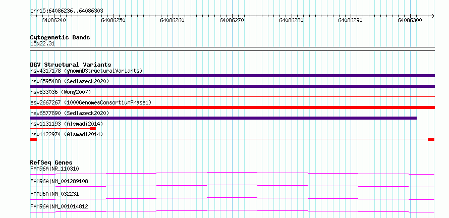 Variant DetailsVariant: nsv1122974| Internal ID | 19251309 | | Landmark | | | Location Information | | | Cytoband | 15q22.31 | | Allele length | | Assembly | Allele length | | hg38 | 68 | | hg19 | 68 |