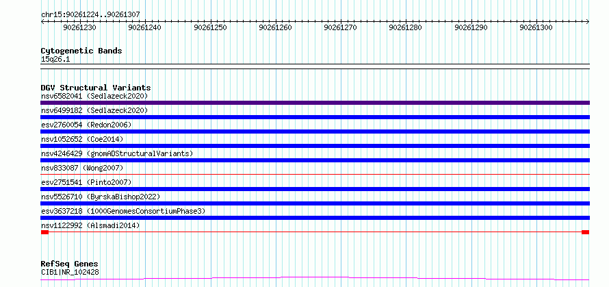 Variant DetailsVariant: nsv1122992| Internal ID | 19273089 | | Landmark | | | Location Information | | | Cytoband | 15q26.1 | | Allele length | | Assembly | Allele length | | hg38 | 84 | | hg19 | 84 |