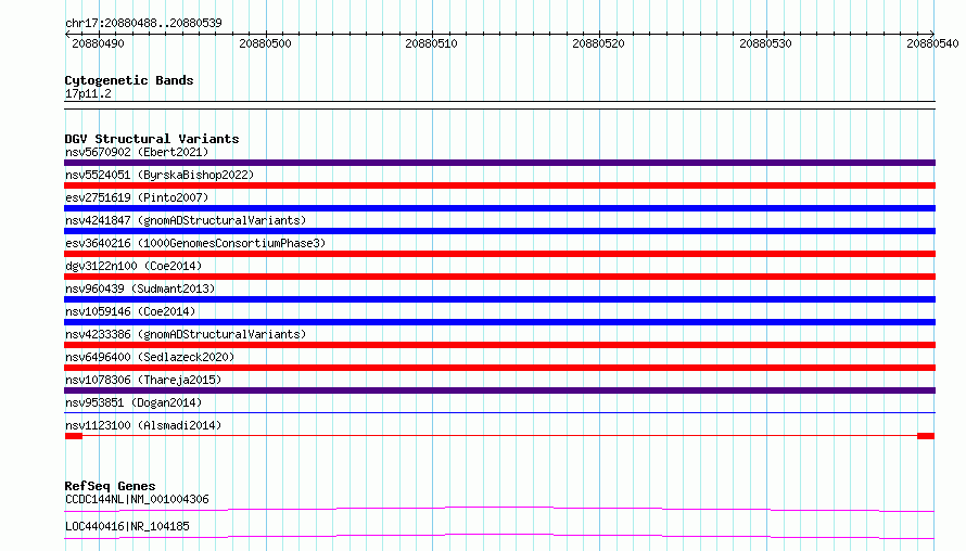 Variant DetailsVariant: nsv1123100| Internal ID | 19282946 | | Landmark | | | Location Information | | | Cytoband | 17p11.2 | | Allele length | | Assembly | Allele length | | hg38 | 52 | | hg19 | 52 |