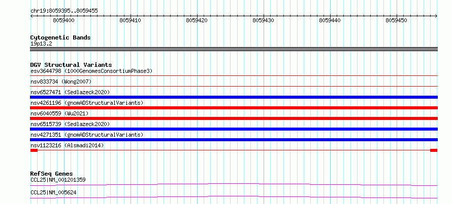 Variant DetailsVariant: nsv1123216| Internal ID | 19281386 | | Landmark | | | Location Information | | | Cytoband | 19p13.2 | | Allele length | | Assembly | Allele length | | hg38 | 61 | | hg19 | 61 |