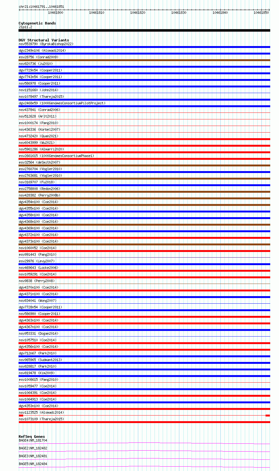 Variant DetailsVariant: nsv1123525| Internal ID | 19263906 | | Landmark | | | Location Information | | | Cytoband | 21p11.1 | | Allele length | | Assembly | Allele length | | hg38 | 61 | | hg19 | 61 |
