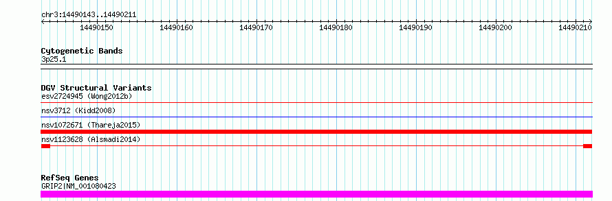 Variant DetailsVariant: nsv1123628| Internal ID | 19249958 | | Landmark | | | Location Information | | | Cytoband | 3p25.1 | | Allele length | | Assembly | Allele length | | hg38 | 69 | | hg19 | 69 |