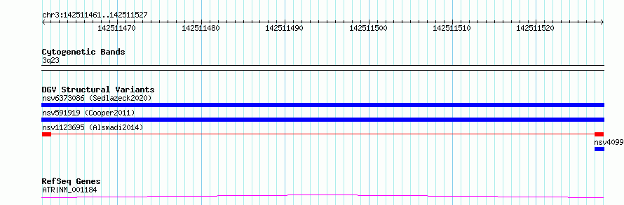 Variant DetailsVariant: nsv1123695| Internal ID | 19272875 | | Landmark | | | Location Information | | | Cytoband | 3q23 | | Allele length | | Assembly | Allele length | | hg38 | 67 | | hg19 | 67 |