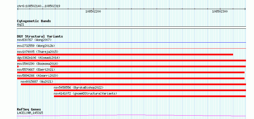 Variant DetailsVariant: nsv1124112| Internal ID | 19276681 | | Landmark | | | Location Information | | | Cytoband | 6q21 | | Allele length | | Assembly | Allele length | | hg38 | 180 | | hg19 | 180 |