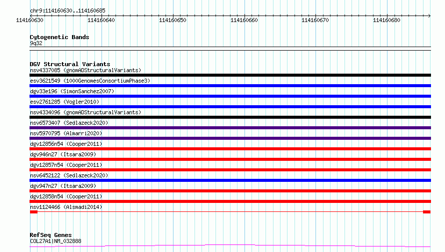 Variant DetailsVariant: nsv1124466| Internal ID | 19247785 | | Landmark | | | Location Information | | | Cytoband | 9q32 | | Allele length | | Assembly | Allele length | | hg38 | 56 | | hg19 | 56 |