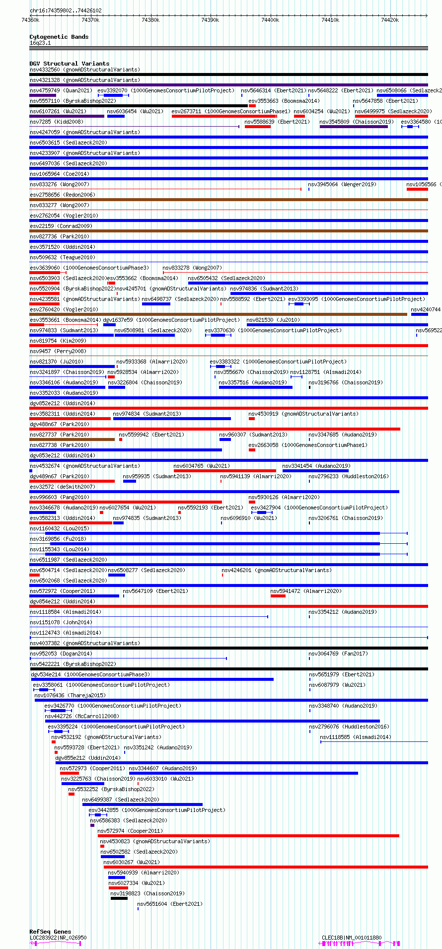 Variant DetailsVariant: nsv1124743| Internal ID | 19250531 | | Landmark | | | Location Information | | | Cytoband | 16q23.1 | | Allele length | | Assembly | Allele length | | hg38 | 66301 | | hg19 | 66301 |