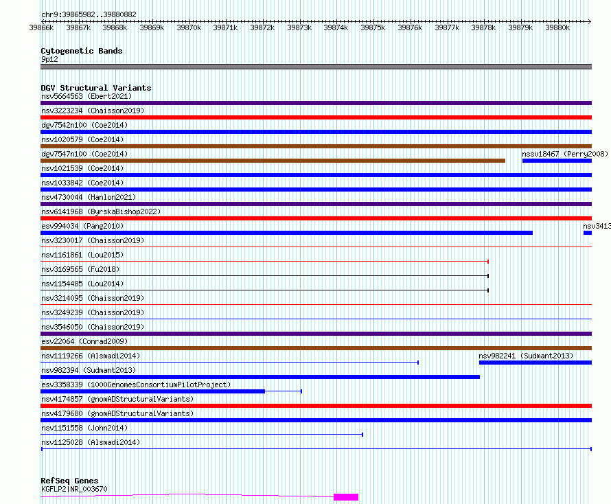 Variant DetailsVariant: nsv1125028| Internal ID | 19249784 | | Landmark | | | Location Information | | | Cytoband | 9p12 | | Allele length | | Assembly | Allele length | | hg38 | 14901 | | hg19 | 14901 |