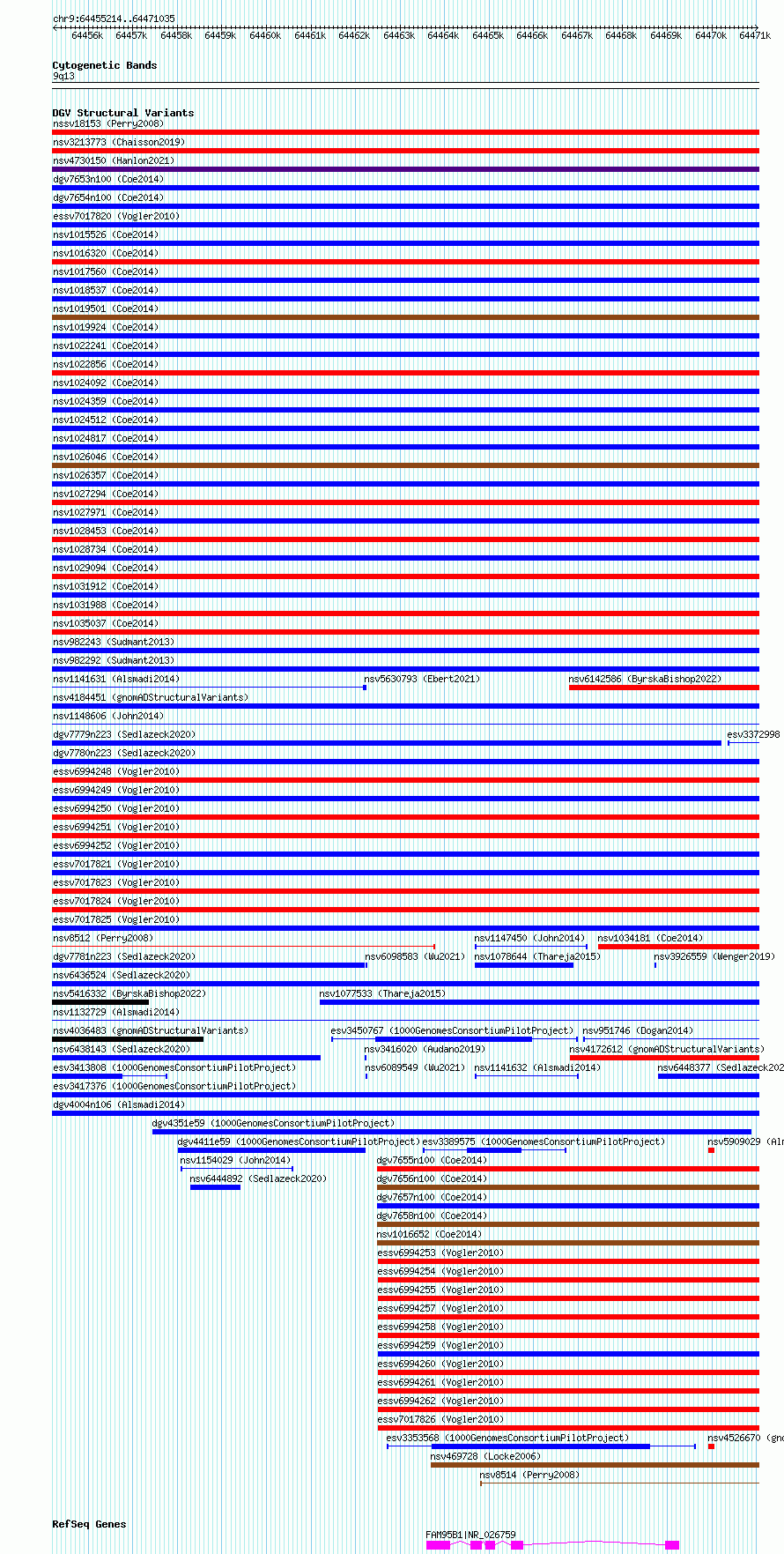 Variant DetailsVariant: nsv1125032| Internal ID | 19254855 | | Landmark | | | Location Information | | | Cytoband | 9p12 | | Allele length | | Assembly | Allele length | | hg38 | 15822 | | hg19 | 15801 |