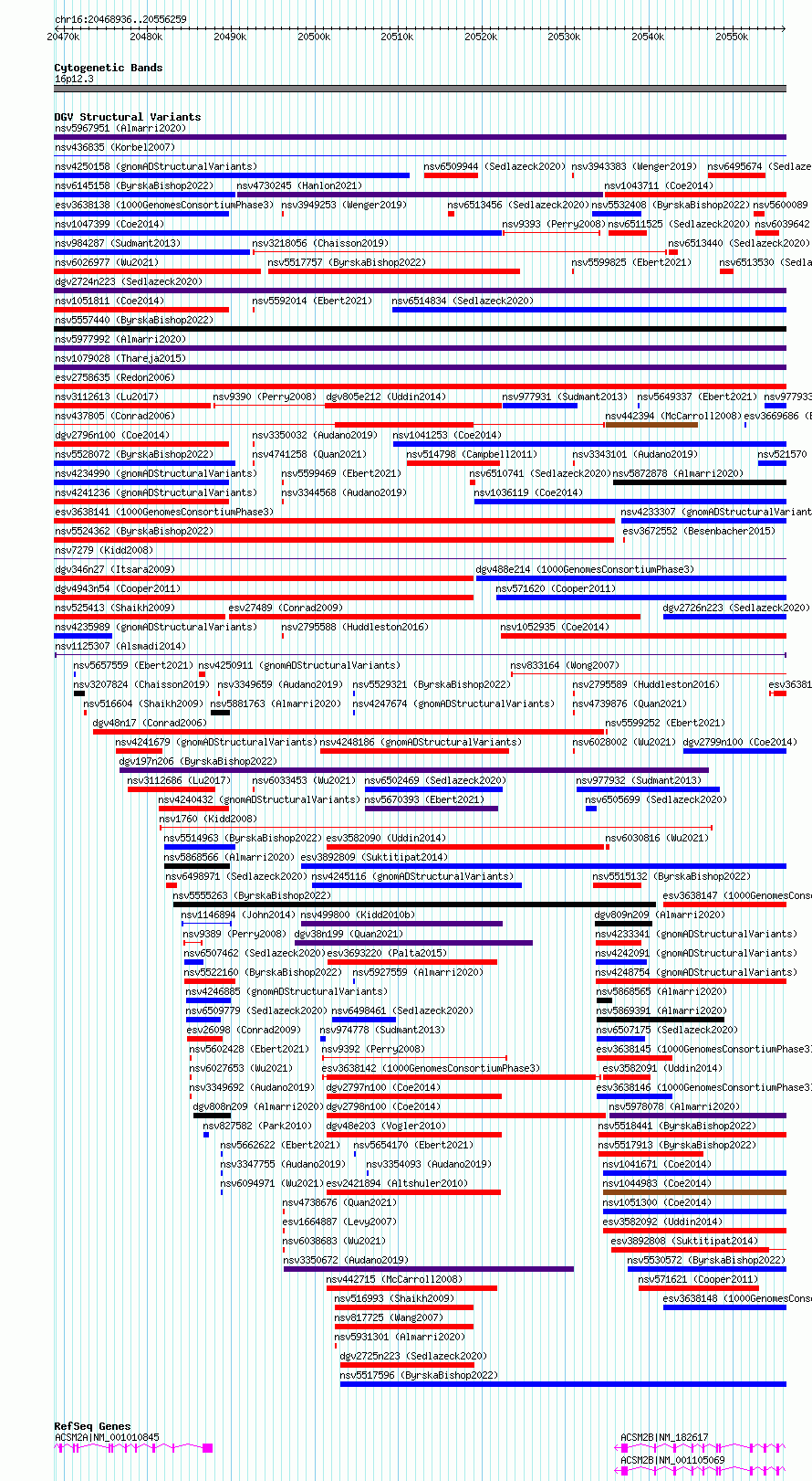 Variant DetailsVariant: nsv1125307| Internal ID | 19286692 | | Landmark | | | Location Information | | | Cytoband | 16p12.3 | | Allele length | | Assembly | Allele length | | hg38 | 87324 | | hg19 | 87324 |