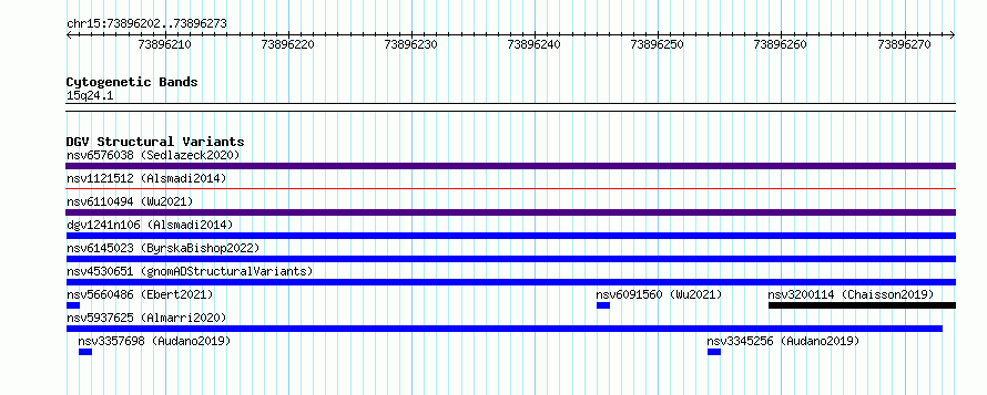 Variant DetailsVariant: nsv1125609| Internal ID | 19272279 | | Landmark | | | Location Information | | | Cytoband | 15q24.1 | | Allele length | | Assembly | Allele length | | hg38 | 72 | | hg19 | 72 |