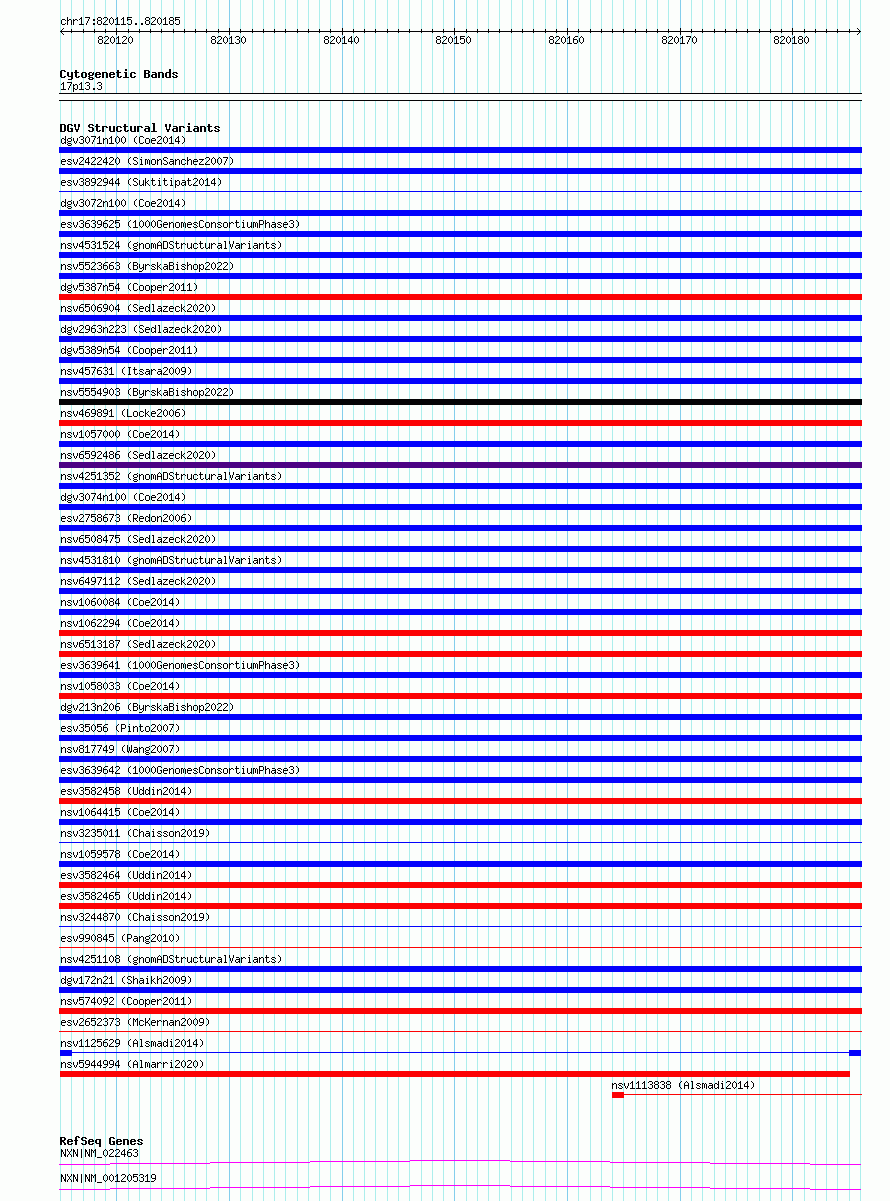 Variant DetailsVariant: nsv1125629| Internal ID | 19265709 | | Landmark | | | Location Information | | | Cytoband | 17p13.3 | | Allele length | | Assembly | Allele length | | hg38 | 71 | | hg19 | 71 |