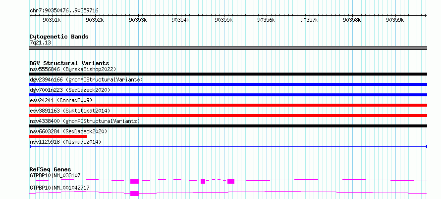 Variant DetailsVariant: nsv1125918| Internal ID | 19260645 | | Landmark | | | Location Information | | | Cytoband | 7q21.13 | | Allele length | | Assembly | Allele length | | hg38 | 9241 | | hg19 | 9241 |