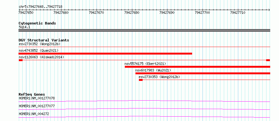Variant DetailsVariant: nsv1126063| Internal ID | 19266177 | | Landmark | | | Location Information | | | Cytoband | 5q14.1 | | Allele length | | Assembly | Allele length | | hg38 | 71 | | hg19 | 71 |