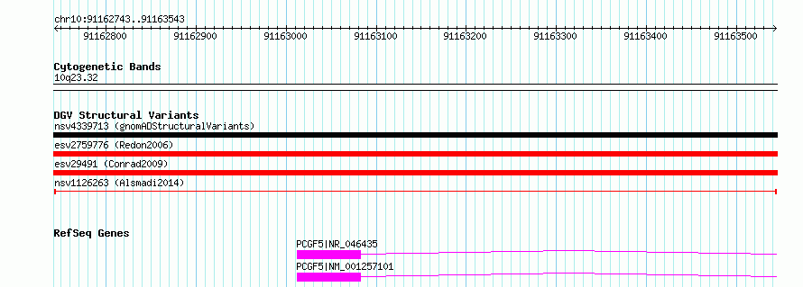 Variant DetailsVariant: nsv1126263| Internal ID | 19268564 | | Landmark | | | Location Information | | | Cytoband | 10q23.32 | | Allele length | | Assembly | Allele length | | hg38 | 801 | | hg19 | 801 |