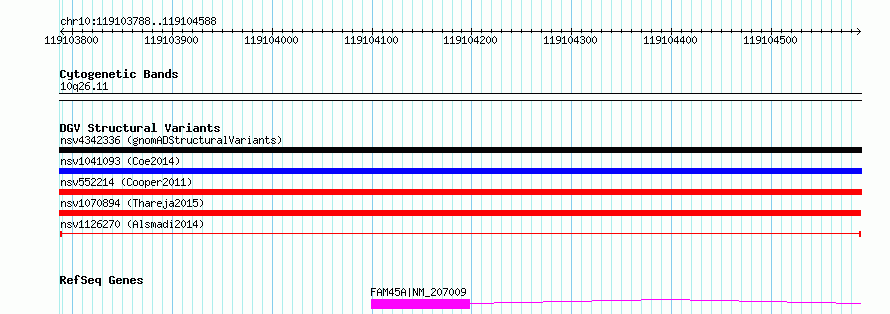 | Variant Type | CNV deletion | Copy Number | | Allele State | | Allele Origin | | Probe Count | | Validation Flag | | Merged Status | M | Merged Variants | | Supporting Variants | nssv3984503 | Samples | KWS1 | Known Genes | FAM45A, FAM45B | Method | Sequencing | Analysis | HugeSeq | Platform | Illumina HiSeq 2000 | Comments | | Reference | Alsmadi_et_al_2014 | Pubmed ID | 24896259 | Accession Number(s) | nsv1126270