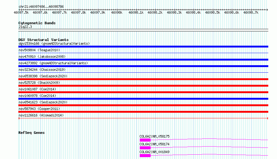 Variant DetailsVariant: nsv1126616| Internal ID | 19276918 | | Landmark | | | Location Information | | | Cytoband | 21q22.3 | | Allele length | | Assembly | Allele length | | hg38 | 1301 | | hg19 | 1301 |