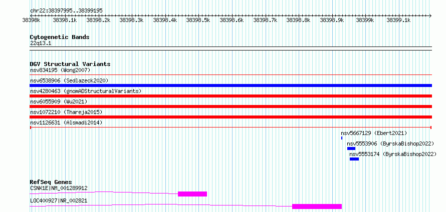 Variant DetailsVariant: nsv1126631| Internal ID | 19250332 | | Landmark | | | Location Information | | | Cytoband | 22q13.1 | | Allele length | | Assembly | Allele length | | hg38 | 1201 | | hg19 | 1201 |
