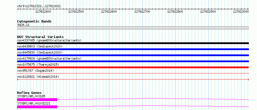 Variant DetailsVariant: nsv1126921| Internal ID | 19278699 | | Landmark | | | Location Information | | | Cytoband | 9q34.11 | | Allele length | | Assembly | Allele length | | hg38 | 701 | | hg19 | 701 |