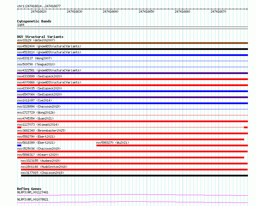 Variant DetailsVariant: nsv1127073| Internal ID | 19274292 | | Landmark | | | Location Information | | | Cytoband | 1q44 | | Allele length | | Assembly | Allele length | | hg38 | 64 | | hg19 | 64 |