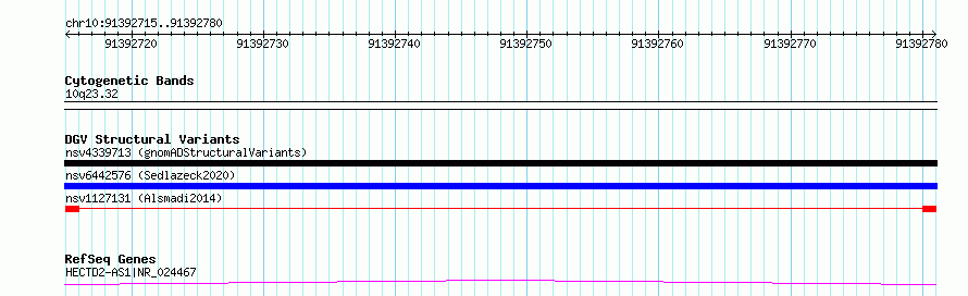 Variant DetailsVariant: nsv1127131| Internal ID | 19285392 | | Landmark | | | Location Information | | | Cytoband | 10q23.32 | | Allele length | | Assembly | Allele length | | hg38 | 66 | | hg19 | 66 |