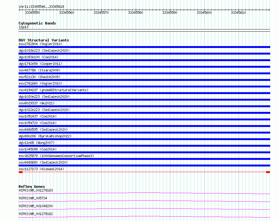 Variant DetailsVariant: nsv1127173| Internal ID | 19265109 | | Landmark | | | Location Information | | | Cytoband | 11p13 | | Allele length | | Assembly | Allele length | | hg38 | 73 | | hg19 | 73 |