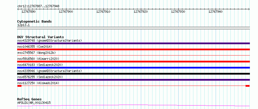 Variant DetailsVariant: nsv1127250| Internal ID | 19283384 | | Landmark | | | Location Information | | | Cytoband | 12p13.1 | | Allele length | | Assembly | Allele length | | hg38 | 62 | | hg19 | 62 |
