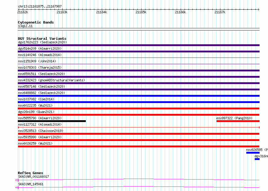 | | Variant Type | CNV deletion | | Copy Number | | | Allele State | | | Allele Origin | | | Probe Count | | | Validation Flag | | | Merged Status | M | | Merged Variants | | | Supporting Variants | nssv3985723 | | Samples | KWS1 | | Known Genes | SKA3 | | Method | Sequencing | | Analysis | HugeSeq | | Platform | Illumina HiSeq 2000 | | Comments | | | Reference | Alsmadi_et_al_2014 | | Pubmed ID | 24896259 | | Accession Number(s) | nsv1127312