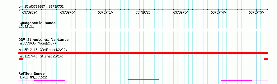 Variant DetailsVariant: nsv1127440| Internal ID | 19262774 | | Landmark | | | Location Information | | | Cytoband | 15q22.31 | | Allele length | | Assembly | Allele length | | hg38 | 66 | | hg19 | 66 |