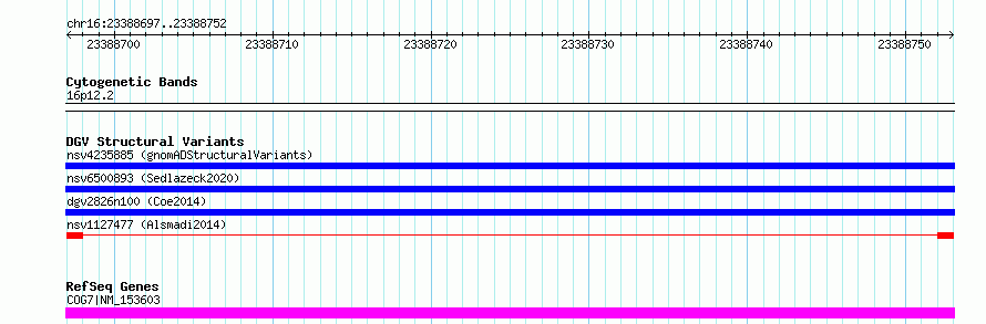 Variant DetailsVariant: nsv1127477| Internal ID | 19281903 | | Landmark | | | Location Information | | | Cytoband | 16p12.2 | | Allele length | | Assembly | Allele length | | hg38 | 56 | | hg19 | 56 |