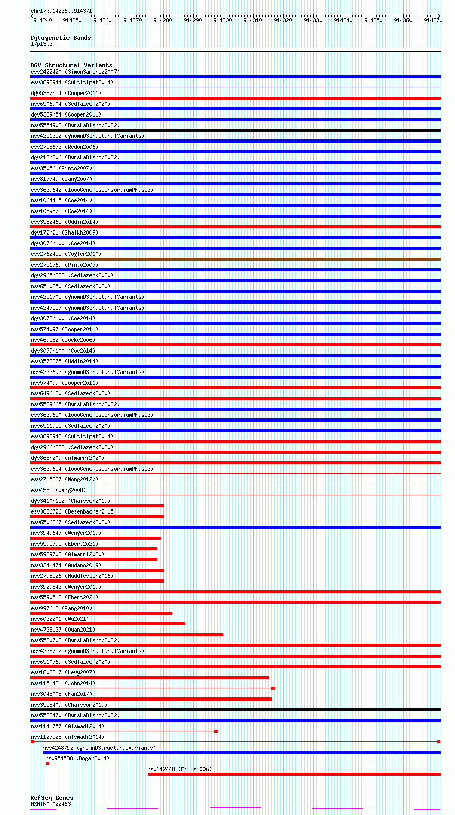 Variant DetailsVariant: nsv1127528| Internal ID | 19261098 | | Landmark | | | Location Information | | | Cytoband | 17p13.3 | | Allele length | | Assembly | Allele length | | hg38 | 136 | | hg19 | 136 |