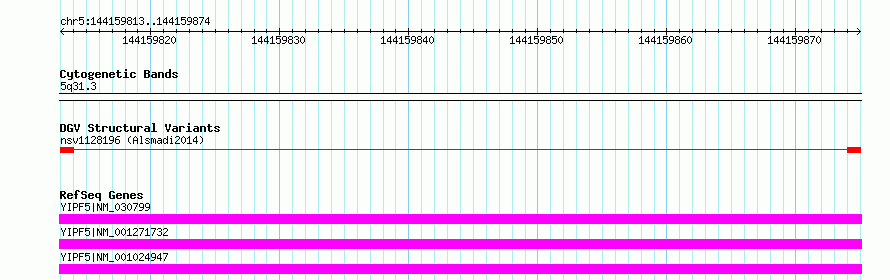 | Variant Type | CNV deletion | Copy Number | | Allele State | | Allele Origin | | Probe Count | | Validation Flag | | Merged Status | M | Merged Variants | | Supporting Variants | nssv3957684 | Samples | KWS1 | Known Genes | YIPF5 | Method | Sequencing | Analysis | HugeSeq | Platform | Illumina HiSeq 2000 | Comments | | Reference | Alsmadi_et_al_2014 | Pubmed ID | 24896259 | Accession Number(s) | nsv1128196