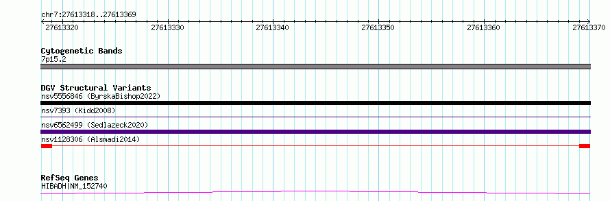 Variant DetailsVariant: nsv1128306| Internal ID | 19280388 | | Landmark | | | Location Information | | | Cytoband | 7p15.2 | | Allele length | | Assembly | Allele length | | hg38 | 52 | | hg19 | 52 |