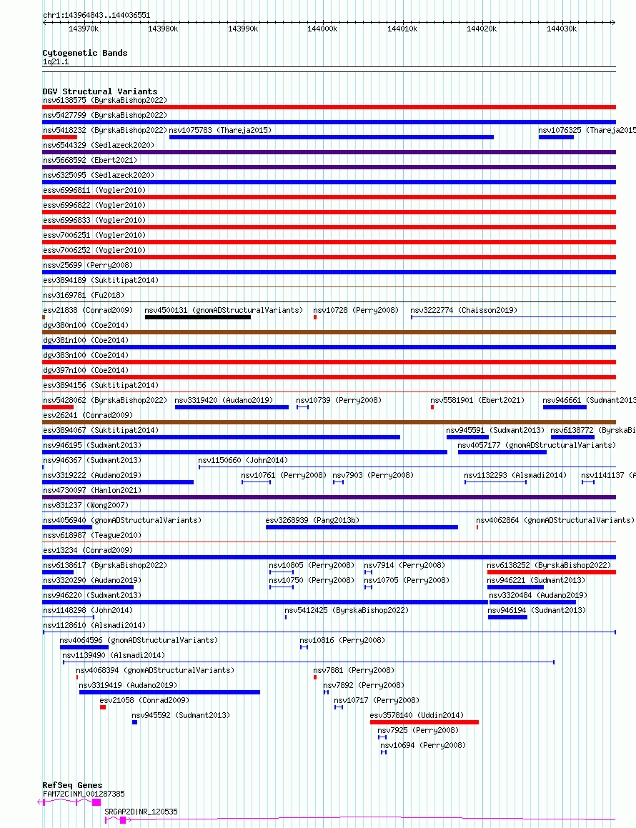 Variant DetailsVariant: nsv1128610| Internal ID | 19256021 | | Landmark | | | Location Information | | | Cytoband | 1q21.1 | | Allele length | | Assembly | Allele length | | hg38 | 71709 | | hg19 | 71701 |