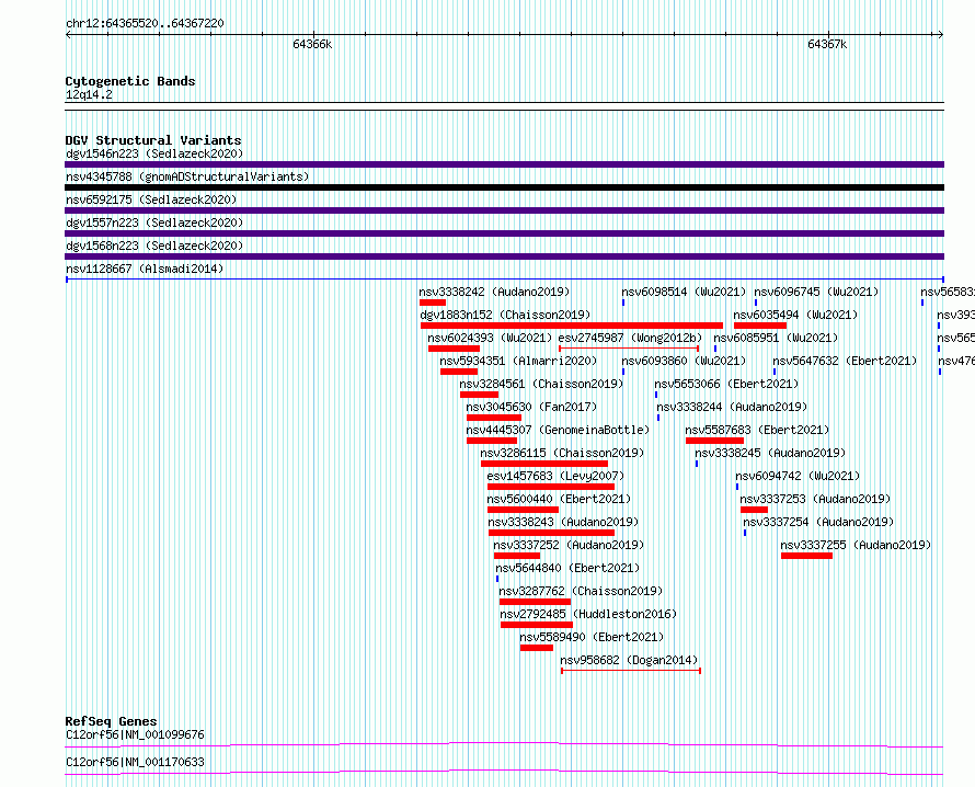 Variant DetailsVariant: nsv1128667| Internal ID | 19275684 | | Landmark | | | Location Information | | | Cytoband | 12q14.2 | | Allele length | | Assembly | Allele length | | hg38 | 1701 | | hg19 | 1701 |