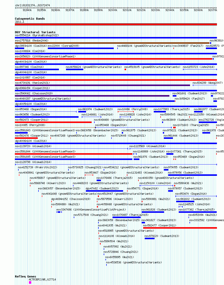 Variant DetailsVariant: nsv1128798| Internal ID | 19254240 | | Landmark | | | Location Information | | | Cytoband | 2p11.1 | | Allele length | | Assembly | Allele length | | hg38 | 141101 | | hg19 | 141101 |