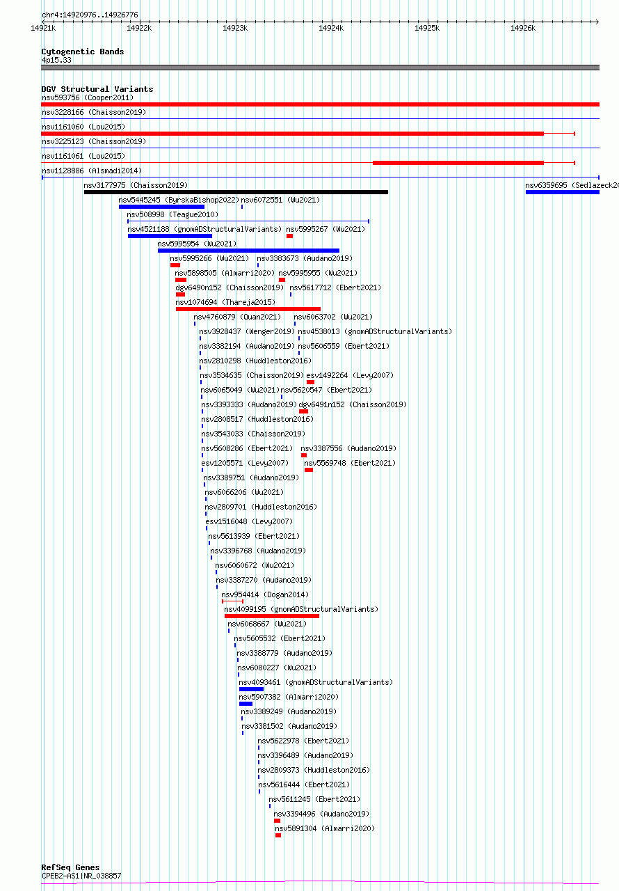 Variant DetailsVariant: nsv1128886| Internal ID | 19280780 | | Landmark | | | Location Information | | | Cytoband | 4p15.33 | | Allele length | | Assembly | Allele length | | hg38 | 5801 | | hg19 | 5801 |