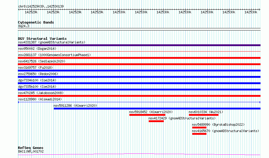 Variant DetailsVariant: nsv1128980| Internal ID | 19287218 | | Landmark | | | Location Information | | | Cytoband | 8q24.3 | | Allele length | | Assembly | Allele length | | hg38 | 1101 | | hg19 | 1101 |
