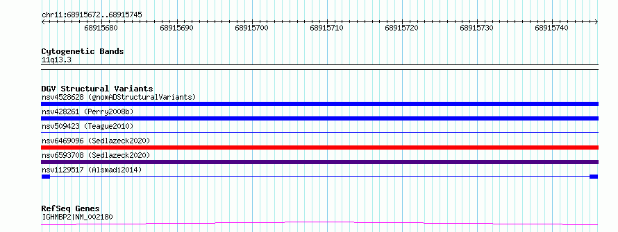 Variant DetailsVariant: nsv1129517| Internal ID | 19267393 | | Landmark | | | Location Information | | | Cytoband | 11q13.3 | | Allele length | | Assembly | Allele length | | hg38 | 74 | | hg19 | 74 |