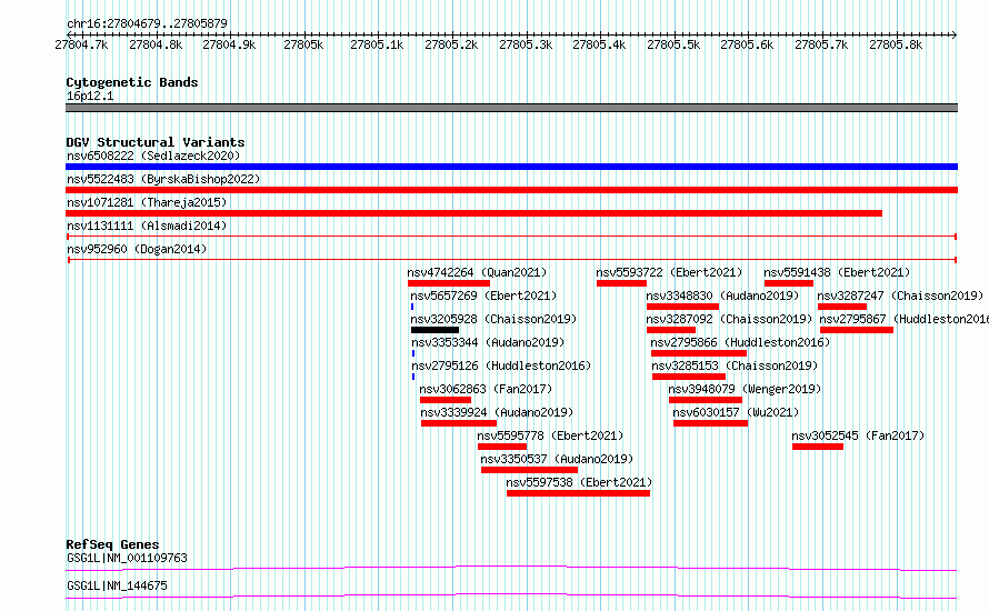 Variant DetailsVariant: nsv1131111| Internal ID | 19264530 | | Landmark | | | Location Information | | | Cytoband | 16p12.1 | | Allele length | | Assembly | Allele length | | hg38 | 1201 | | hg19 | 1201 |