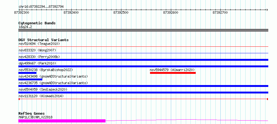 Variant DetailsVariant: nsv1131120| Internal ID | 19264513 | | Landmark | | | Location Information | | | Cytoband | 16q24.2 | | Allele length | | Assembly | Allele length | | hg38 | 501 | | hg19 | 501 |