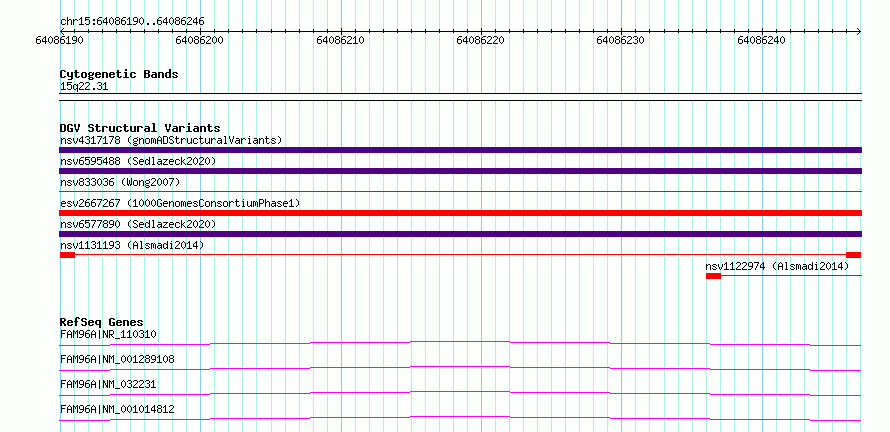 Variant DetailsVariant: nsv1131193| Internal ID | 19262798 | | Landmark | | | Location Information | | | Cytoband | 15q22.31 | | Allele length | | Assembly | Allele length | | hg38 | 57 | | hg19 | 57 |