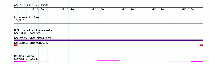 Variant DetailsVariant: nsv1131196| Internal ID | 19251134 | | Landmark | | | Location Information | | | Cytoband | 15q22.31 | | Allele length | | Assembly | Allele length | | hg38 | 63 | | hg19 | 63 |