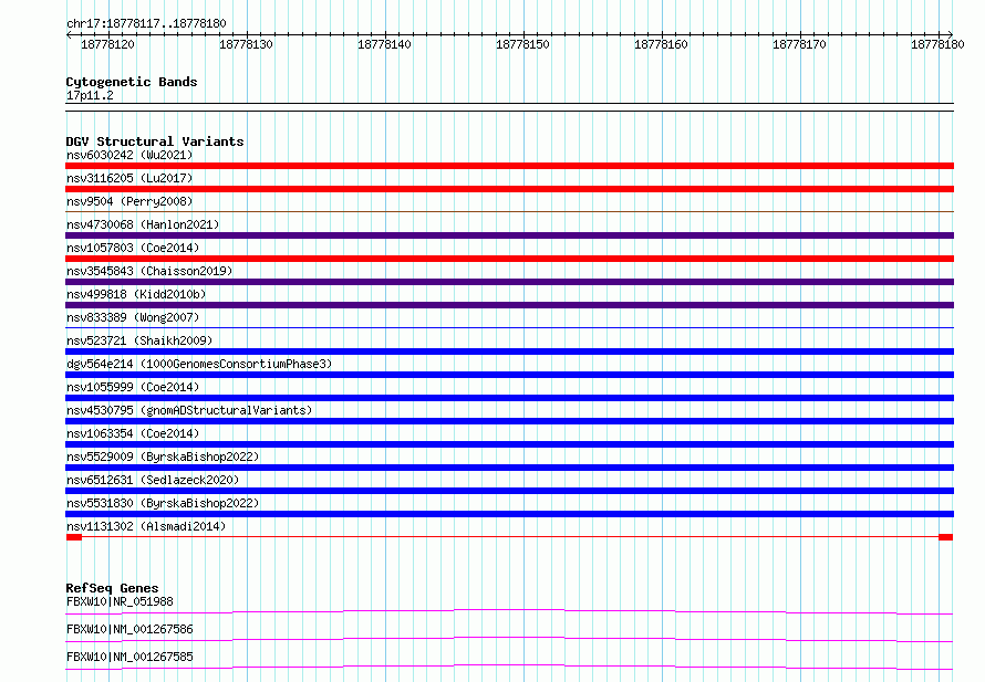 Variant DetailsVariant: nsv1131302| Internal ID | 19282061 | | Landmark | | | Location Information | | | Cytoband | 17p11.2 | | Allele length | | Assembly | Allele length | | hg38 | 64 | | hg19 | 64 |