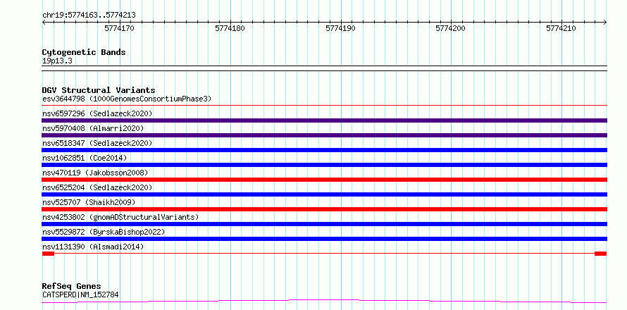Variant DetailsVariant: nsv1131390| Internal ID | 19283524 | | Landmark | | | Location Information | | | Cytoband | 19p13.3 | | Allele length | | Assembly | Allele length | | hg38 | 51 | | hg19 | 51 |