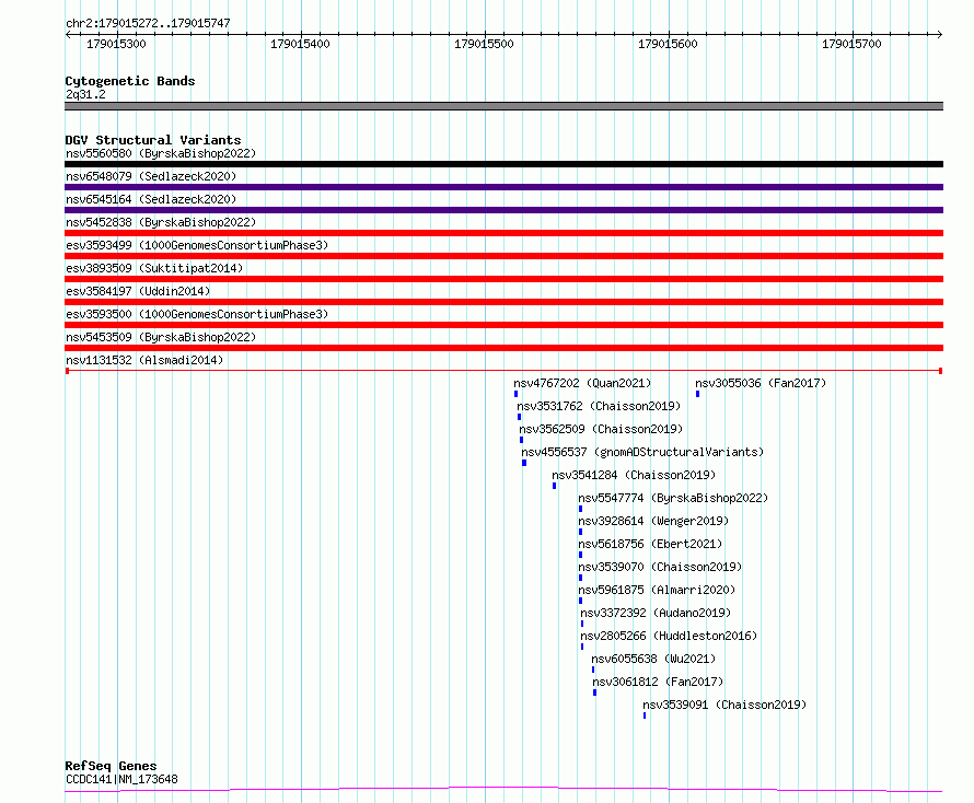 Variant DetailsVariant: nsv1131532| Internal ID | 19249338 | | Landmark | | | Location Information | | | Cytoband | 2q31.2 | | Allele length | | Assembly | Allele length | | hg38 | 476 | | hg19 | 476 |