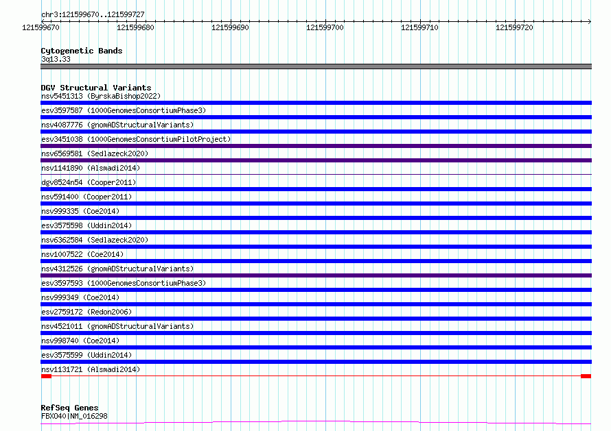 Variant DetailsVariant: nsv1131721| Internal ID | 19251468 | | Landmark | | | Location Information | | | Cytoband | 3q13.33 | | Allele length | | Assembly | Allele length | | hg38 | 58 | | hg19 | 58 |